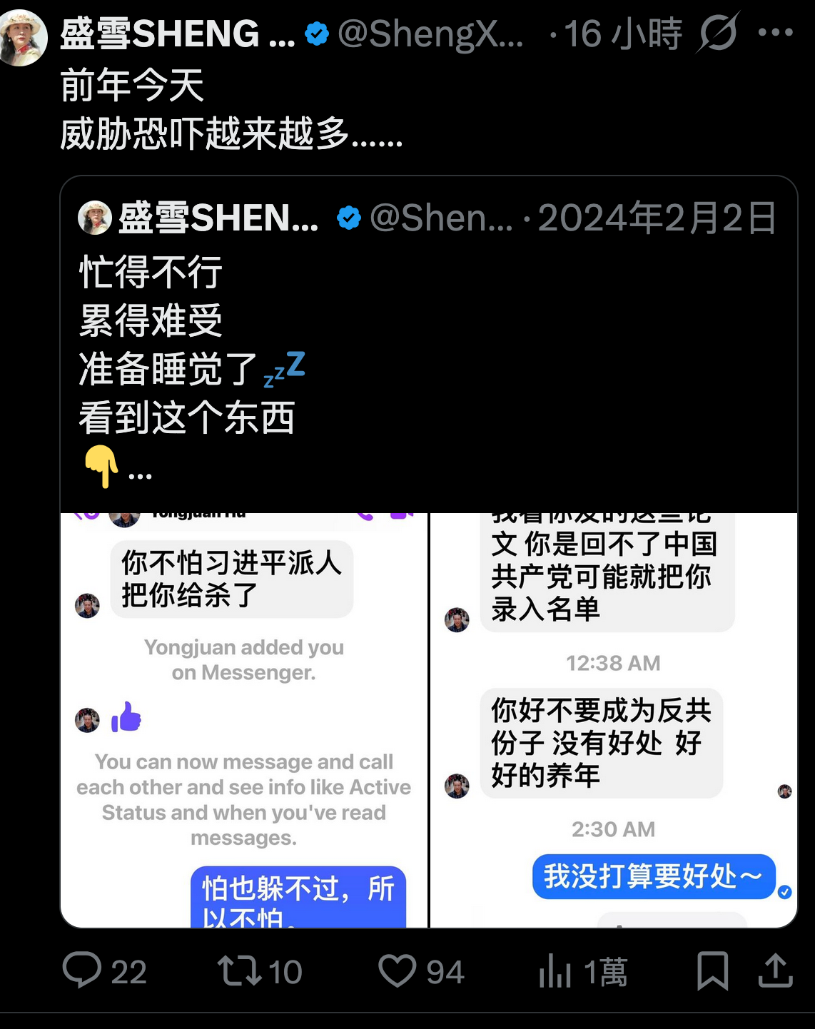 In a post Sheng Xue published after deleting the original one, she said that ‘the threats and intimidation are increasing,’ and reposted a message from two years ago. At that time, someone asked her, “Aren’t you afraid Xi Jinping might send someone to kill you?” She replied, “Even if I’m afraid, I can’t escape it—so I’m not afraid.”