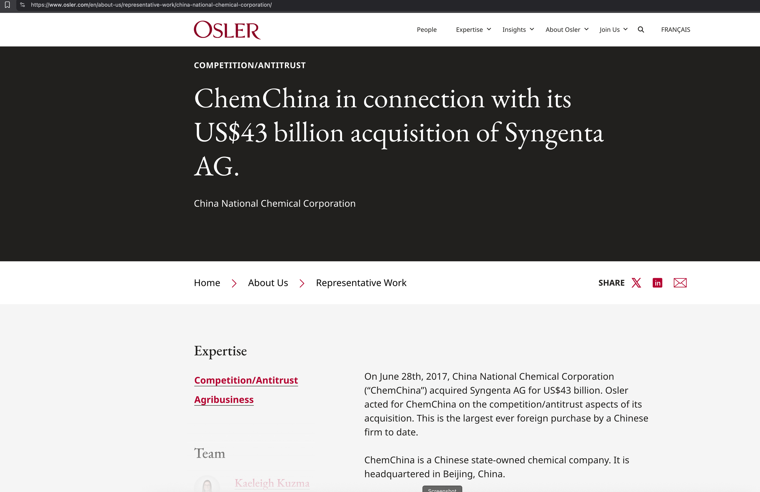 Screenshot of Osler’s “About Us” page: “Osler acted for ChemChina on the competition/antitrust aspects of its acquisition”. Source: https://www.osler.com/en/about-us/representative-work/china-national-chemical-corporation/