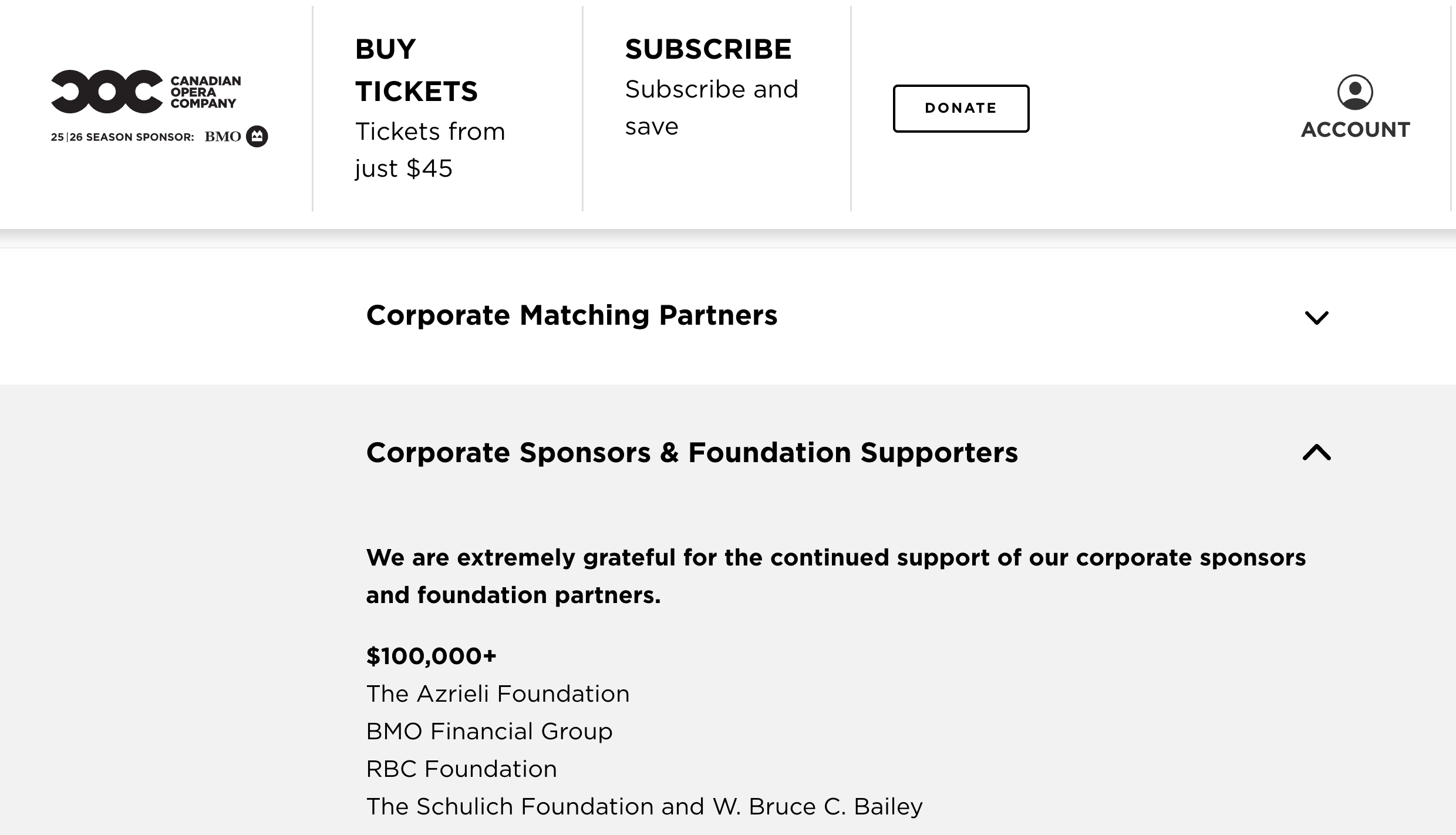 BMO Financial Group remains the COC’s Season Sponsor — its highest-profile corporate backer at the $100,000+ tier — for the 2024/25 and 2025/26 seasons. Ferguson’s former employer literally brands the opera house he now runs.
