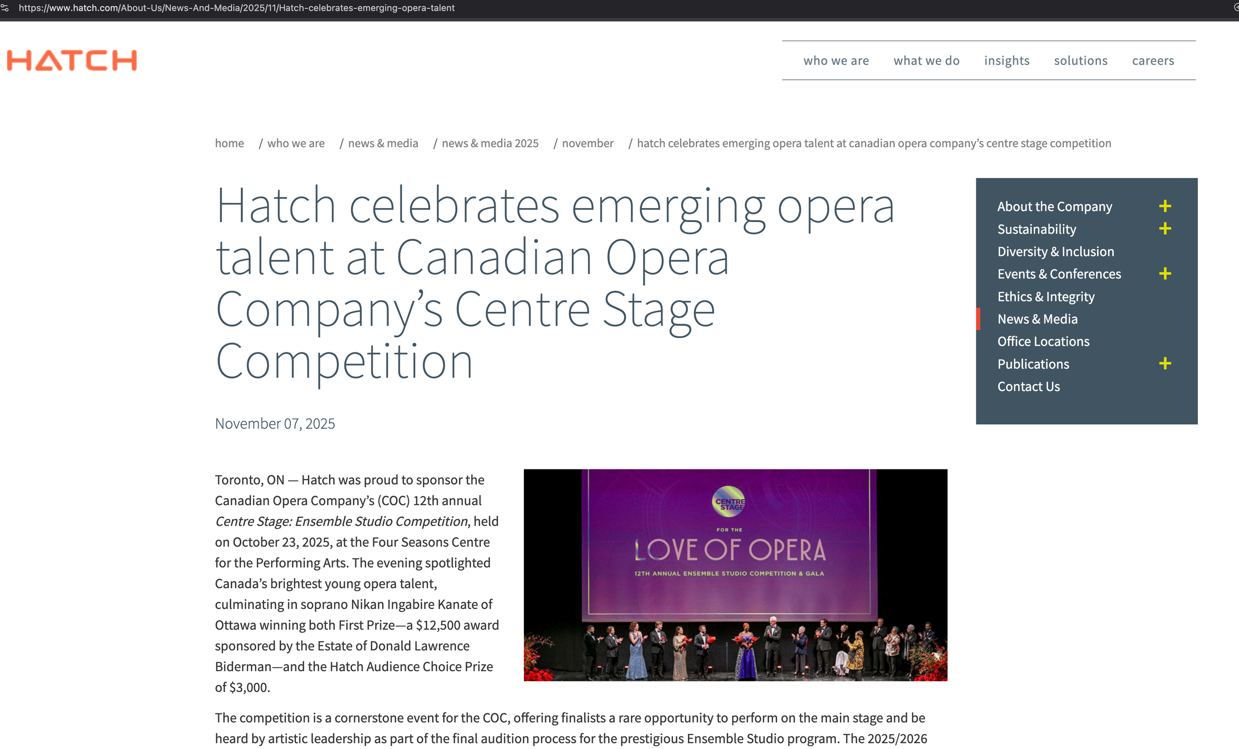 Hatch celebrates emerging opera talent at Canadian Opera Company’s Centre Stage Competition. Source: https://www.hatch.com/About-Us/News-And-Media/2025/11/Hatch-celebrates-emerging-opera-talent