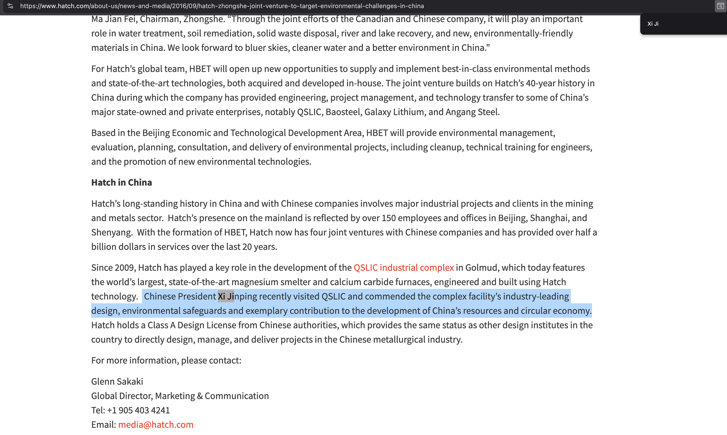 赫氏集团与中国企业成立了四个合资公司,持有中国当局颁发的罕见「A类设计资质」,与中国国内设计院享有同等地位。其在格尔木的青海盐湖工业股份公司项目曾被习近平亲自视察并公开表扬,习称赞其「设计领先、环保出色,对中国资源和循环经济发展做出典范贡献」。