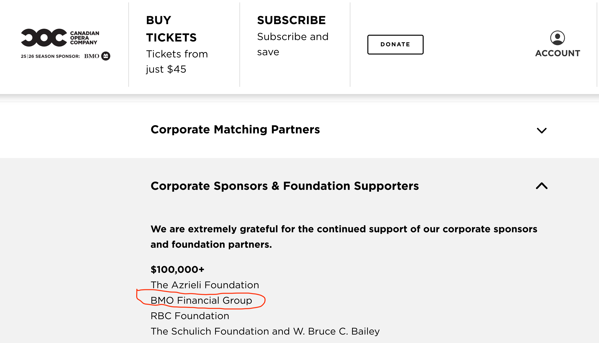 BMO金融集团是加拿大歌剧公司的大赞助商。来源: https://www.coc.ca/support/supporter-recognition
