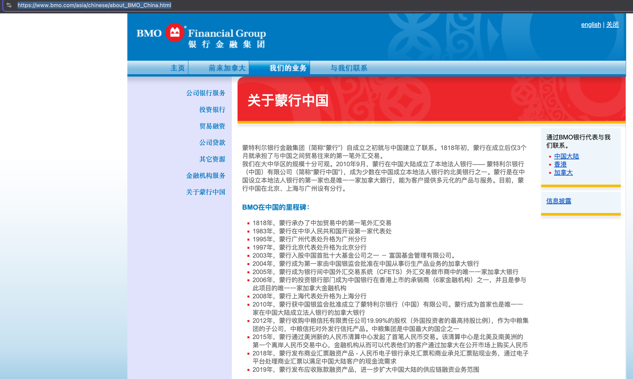 蒙特利尔银行金融集团(简称「蒙行」)在中国的「里程碑」。来源:https://www.bmo.com/asia/chinese/about_BMO_China.html