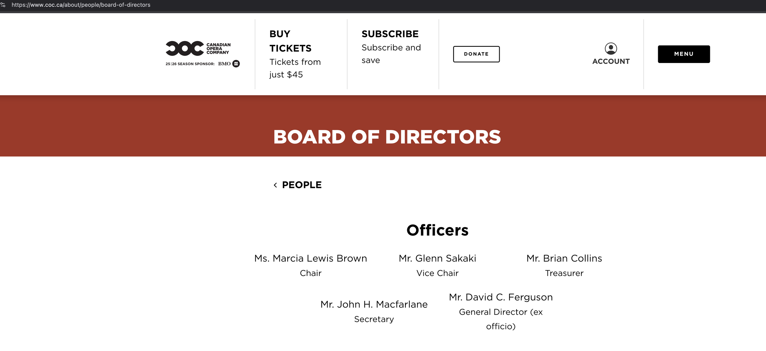 加拿大歌剧公司董事会副主席兼慈善与赞助委员会主席是格伦·坂木(Glenn Sakaki),其本职是加拿大工程咨询巨头赫氏集团(Hatch Ltd.)的全球营销与传播总监。赫氏集团在过去40多年里为中国国有企业提供了超过5亿美元的工程服务,客户包括宝钢(现宝武集团)、鞍钢、青海盐湖工业股份有限公司等大型国企。