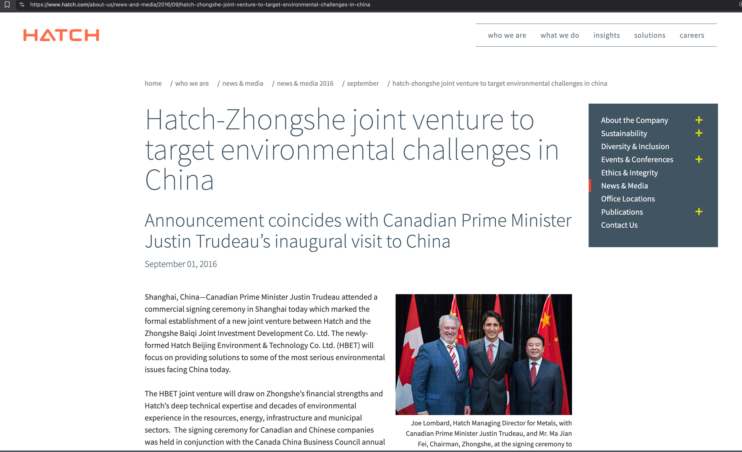 2016年,加拿大总理特鲁多还亲自出席了赫氏集团与中国企业的合资签约仪式。来源:https://www.hatch.com/about-us/news-and-media/2016/09/hatch-zhongshe-joint-venture-to-target-environmental-challenges-in-china